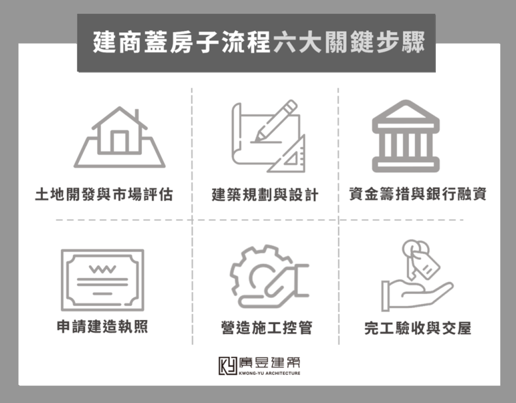 建商蓋房子的過程可以分為幾個主要階段:從土地取得到規劃設計,再到資金籌措、申請法規許可、施工過程及最終的銷售交屋。每一個階段都環環相扣,成功的關鍵在於每一步的順利執行,這裡先簡單帶過,等會一一詳細與大家說明。