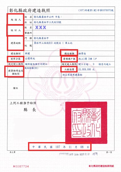 • 起造人與設計人:在這張範例中,「起造人」是「彰化縣員林市公所」,而「設計人」則是「xxx」。這清楚地告訴你,誰是這個建案的申請人,以及是哪位建築師負責設計。